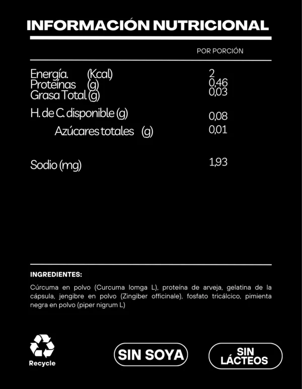 La incorporación de pimienta negra (piperina) es fundamental, ya que aumenta de forma significativa la biodisponibilidad de la curcumina, permitiendo que el organismo la absorba y utilice de manera más eficiente. Esta combinación genera un efecto sinérgico, donde los tres ingredientes se potencian entre sí para lograr un impacto biológico superior al de cada uno por separado.